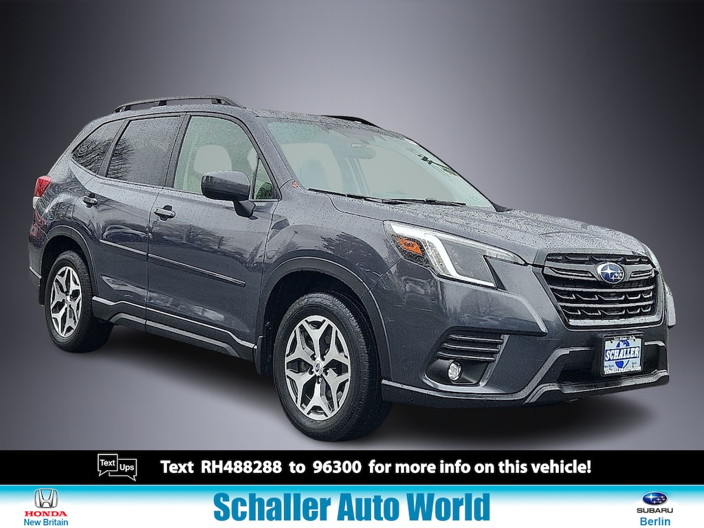 Magnetite Gray Metallic 2024 Subaru Forester Premium 2.5L 4-Cylinder DOHC 16V Lineartronic CVT AWDOdometer is 11895 miles below market average! 26/33 City/Highway MPGSchaller Auto Group has TWO Used Car Locations: Right off Route 9 in New Britain and Route 9 and the Berlin Turnpike in Berlin. Please call 860-826-2023 to confirm this Vehicle's Location. All of our Pre-Owned Vehicles go through our Comprehensive 125 Point Quality Inspection. Every Schaller pre-owned vehicle comes with warranty coverage! With all budgets in mind we now offer Schaller âValue Carsâ starting at $2995 and include a 30 day satisfaction guarantee and all come with a FREE Carfax Vehicle History Report. The Schaller Auto Group is Family Owned and Operated for Over 65 Years and is known for Selling Top Quality Used Vehicles and Standing behind them After the Sale!
