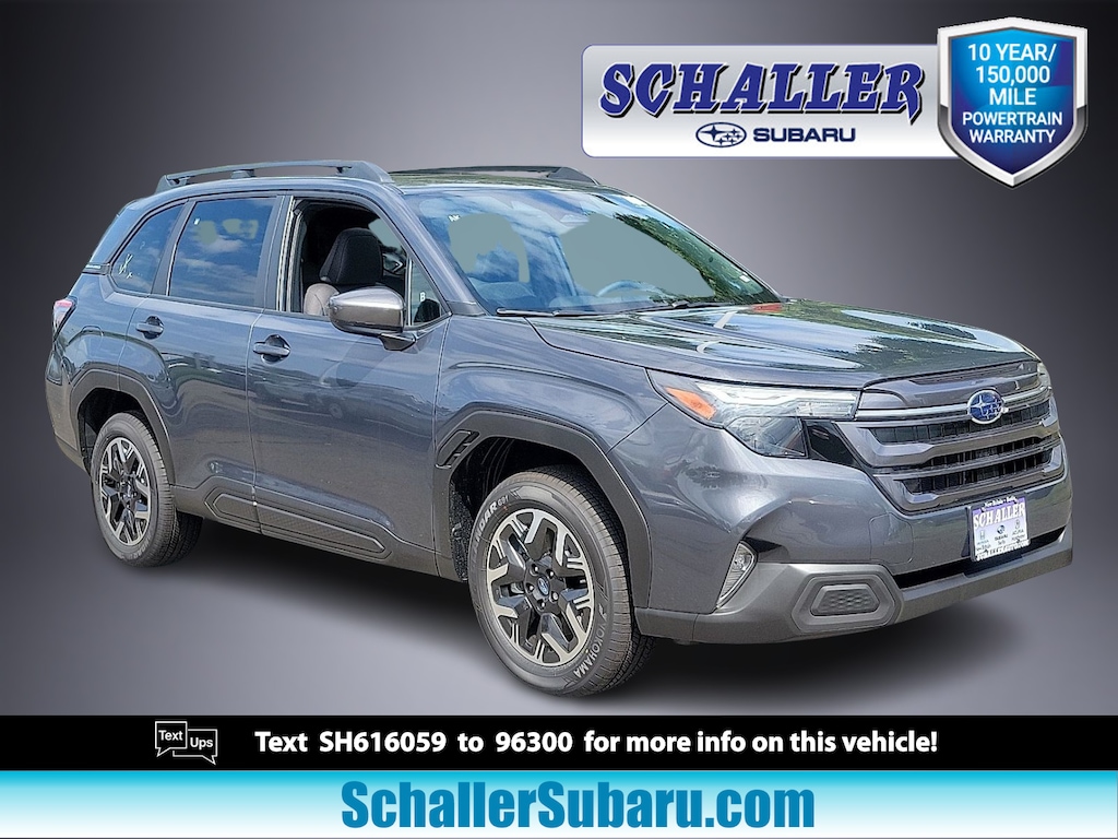 "Recent Arrival! Schaller Auto World is pleased to offer this fantastic 2025 Subaru Forester Premium in Magnetite Gray Metallic Beautifully equipped with Power Rear Gate & Blind Spot Detection w/RCTA (Automatic Emergency Steering Blind-Spot Detection (BSD)/RCTA System and Power Rear Gate) 4-Wheel Disc Brakes 6 Speakers ABS brakes Air Conditioning Alloy wheels AM/FM radio: SiriusXM with 360L Anti-whiplash front head restraints Auto High-beam Headlights Automatic temperature control Brake assist Bumpers: body-color Driver door bin Driver vanity mirror Dual front impact airbags Dual front side impact airbags Electronic Stability Control Emergency communication system: MySubaru Safety (3-year free trial) Exterior Parking Camera Rear Four wheel independent suspension Front anti-roll bar Front Bucket Seats Front Center Armrest Front dual zone A/C Front fog lights Front reading lights Fully automatic headlights Heated door mirrors Heated Front Bucket Seats Heated front seats Illuminated entry Knee airbag Leather steering wheel Low tire pressure warning Occupant sensing airbag Outside temperature display Overhead airbag Overhead console Panic alarm Passenger door bin Passenger vanity mirror Power door mirrors Power driver seat Power moonroof: Panoramic Power steering Power windows Premium Textured Cloth Upholstery Radio data system Radio: Subaru 11.6""Multimedia Plus System Rear anti-roll bar Rear seat center armrest Rear window defroster Rear window wiper Remote keyless entry Security system Speed control Speed-sensing steering Split folding rear seat Spoiler Steering wheel mounted audio controls Tachometer Telescoping steering wheel Tilt steering wheel Traction control Trip computer Variably intermittent wipers and Wheels: 17""x 7.0 J Dark Metallic Aluminum-Alloy!All new Schaller Cars Trucks and SUV's come with our EXCLUSIVE 10 year 150000 mile powertrain warranty! The Schaller Auto Group has been Serving the Communities around Hartford New Britain Berlin and Middletown since 1953. We have Hundreds of new and pre-owned vehicles in stock."