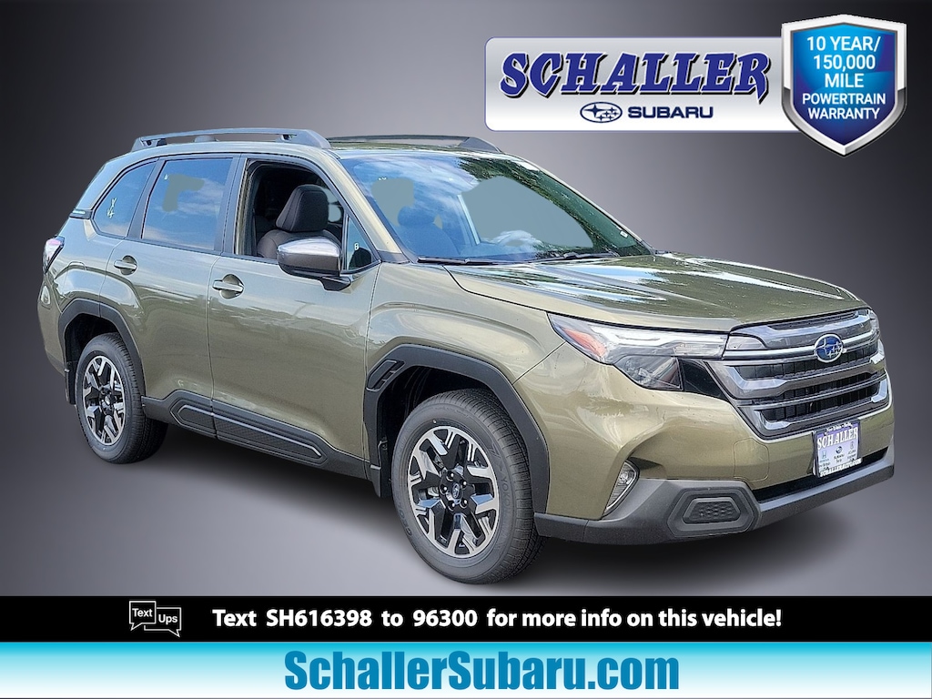 "Recent Arrival! Schaller Auto World is very proud to offer this beautiful 2025 Subaru Forester Premium in Autumn Green Metallic Beautifully equipped with Power Rear Gate & Blind Spot Detection w/RCTA (Automatic Emergency Steering Blind-Spot Detection (BSD)/RCTA System and Power Rear Gate) 4-Wheel Disc Brakes 6 Speakers ABS brakes Air Conditioning Alloy wheels AM/FM radio: SiriusXM with 360L Anti-whiplash front head restraints Auto High-beam Headlights Automatic temperature control Brake assist Bumpers: body-color Driver door bin Driver vanity mirror Dual front impact airbags Dual front side impact airbags Electronic Stability Control Emergency communication system: MySubaru Safety (3-year free trial) Exterior Parking Camera Rear Four wheel independent suspension Front anti-roll bar Front Bucket Seats Front Center Armrest Front dual zone A/C Front fog lights Front reading lights Fully automatic headlights Heated door mirrors Heated Front Bucket Seats Heated front seats Illuminated entry Knee airbag Leather steering wheel Low tire pressure warning Occupant sensing airbag Outside temperature display Overhead airbag Overhead console Panic alarm Passenger door bin Passenger vanity mirror Power door mirrors Power driver seat Power moonroof: Panoramic Power steering Power windows Premium Textured Cloth Upholstery Radio data system Radio: Subaru 11.6""Multimedia Plus System Rear anti-roll bar Rear seat center armrest Rear window defroster Rear window wiper Remote keyless entry Security system Speed control Speed-sensing steering Split folding rear seat Spoiler Steering wheel mounted audio controls Tachometer Telescoping steering wheel Tilt steering wheel Traction control Trip computer Variably intermittent wipers and Wheels: 17""x 7.0 J Dark Metallic Aluminum-Alloy!All new Schaller Cars Trucks and SUV's come with our EXCLUSIVE 10 year 150000 mile powertrain warranty! The Schaller Auto Group has been Serving the Communities around Hartford New Britain Berlin and Middletown since 1953. We have Hundreds of new and pre-owned vehicles in stock."