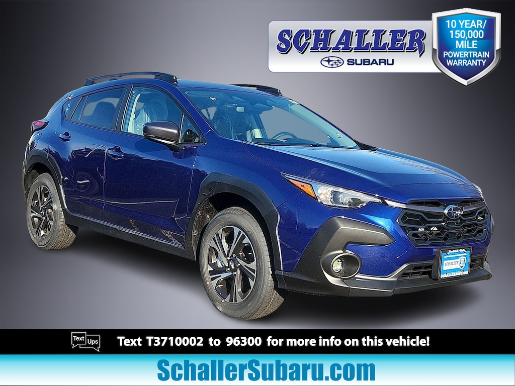 "Recent Arrival! Schaller Auto World is pumped up to offer this charming 2026 Subaru Crosstrek Premium in Sapphire Blue Pearl Beautifully equipped with All-Weather Package (Dual-Mode Heated Front Seats Heated Power Exterior Mirrors and Windshield De-Icer Wipers) BSD/RCTA and All Weather Package and Power Driver Seat and Power Moonroof (10-Way Power Driver's Seat Blind Spot Detection (BSD) Power Moonroof and Rear Cross-Traffic Alert (RCTA) System) 4-Wheel Disc Brakes 6 Speakers ABS brakes Air Conditioning All-Weather Floor Liners Alloy wheels AM/FM radio: SiriusXM Anti-whiplash front head restraints Auto High-beam Headlights Automatic temperature control Brake assist Bumpers: body-color Cloth Upholstery Driver door bin Driver vanity mirror Dual front impact airbags Dual front side impact airbags Electronic Stability Control Emergency communication system: MySubaru Companion (5-years free) Exterior Parking Camera Rear Four wheel independent suspension Front anti-roll bar Front Bucket Seats Front Center Armrest Front dual zone A/C Front fog lights Front reading lights Fully automatic headlights Illuminated entry Knee airbag Low tire pressure warning Occupant sensing airbag Outside temperature display Overhead airbag Overhead console Panic alarm Passenger door bin Passenger vanity mirror Power door mirrors Power steering Power windows Radio data system Radio: Subaru 11.6""Multimedia Plus System Rear anti-roll bar Rear Bumper Cover Rear seat center armrest Rear side impact airbag Rear window defroster Rear window wiper Remote keyless entry Security system Speed control Speed-sensing steering Split folding rear seat Spoiler Steering wheel mounted audio controls Tachometer Telescoping steering wheel Tilt steering wheel Traction control Trip computer Turn signal indicator mirrors Variably intermittent wipers Wheel Locks - Alloy and Wheels: 17""x 7.0""J Machine Finish Aluminum-Alloy!All new Schaller Cars Trucks and SUV's come with our EXCLUSIVE 10 year 150000 mile powertrain warranty! The Schaller Auto Group has been Serving the Communities around Hartford New Britain Berlin and Middletown since 1953. We have Hundreds of new and pre-owned vehicles in stock."