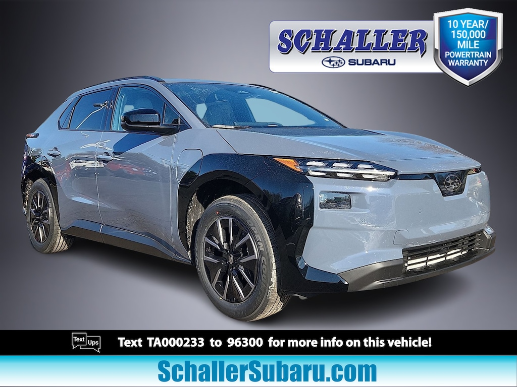"Schaller Auto World is delighted to offer this terrific 2026 Subaru Solterra Premium in Harbor Mist Gray Pearl Beautifully equipped with 4-Wheel Disc Brakes 6 Speakers ABS brakes Air Conditioning Alloy wheels AM/FM radio: SiriusXM Apple CarPlay & Android Auto Auto High-beam Headlights Auto-dimming Rear-View mirror Automatic temperature control Brake assist Bumpers: body-color Driver door bin Driver vanity mirror Dual front impact airbags Dual front side impact airbags Electronic Stability Control Emergency communication system Exterior Parking Camera Rear Four wheel independent suspension Front anti-roll bar Front Bucket Seats Front Center Armrest Front dual zone A/C Front reading lights Fully automatic headlights Garage door transmitter: HomeLink Headlight cleaning Heated door mirrors Heated Front Bucket Seats Heated front seats Illuminated entry Knee airbag Leather steering wheel Low tire pressure warning Navigation System Occupant sensing airbag Outside temperature display Overhead airbag Overhead console Panic alarm Passenger door bin Passenger vanity mirror Power door mirrors Power driver seat Power Liftgate Power steering Power windows Radio data system Radio: : Subaru 14""Multimedia System Rain sensing wipers Rear anti-roll bar Rear reading lights Rear seat center armrest Rear window defroster Remote keyless entry Security system Speed control Speed-sensing steering Split folding rear seat Spoiler StarTex Upholstery Steering wheel mounted audio controls Telescoping steering wheel Tilt steering wheel Traction control Trip computer Turn signal indicator mirrors Variably intermittent wipers and Wheels: : 18""x 7.5""J Aluminum-Alloy!All new Schaller Cars Trucks and SUV's come with our EXCLUSIVE 10 year 150000 mile powertrain warranty! The Schaller Auto Group has been Serving the Communities around Hartford New Britain Berlin and Middletown since 1953. We have Hundreds of new and pre-owned vehicles in stock."