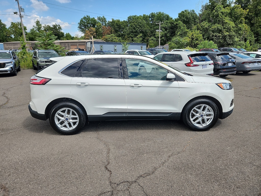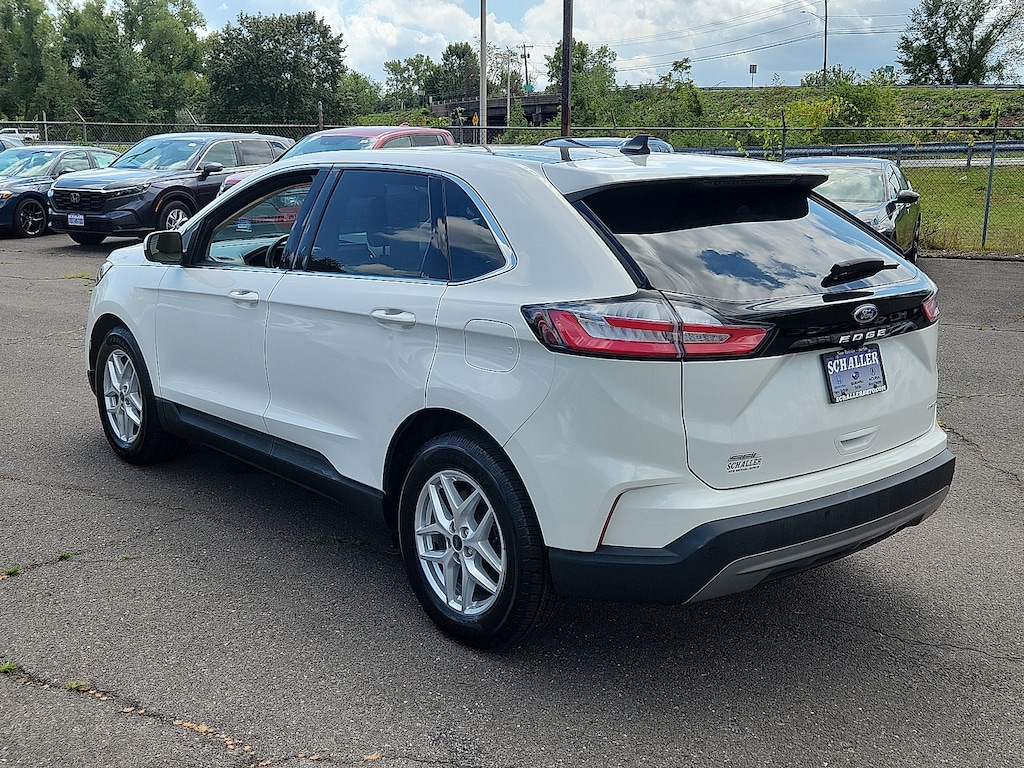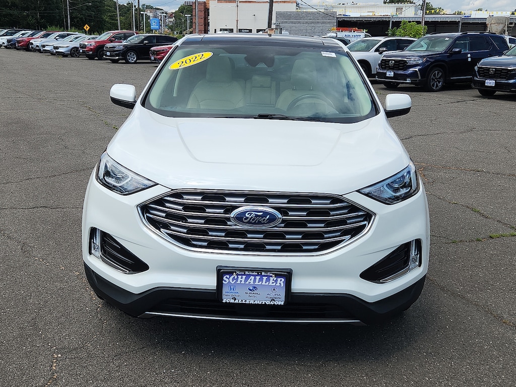 "Star White Metallic Tri-Coat 2022 Ford Edge SEL EcoBoost 2.0L I4 GTDi DOHC Turbocharged VCT 8-Speed Automatic AWD110V/150W AC Power Outlet 3.80 Axle Ratio 4-Wheel Disc Brakes 6 Speakers ABS brakes ActiveX Seating Material Heated Bucket Seats Adaptive Cruise Control w/Stop & Go Air Conditioning Alloy wheels AM/FM radio: SiriusXM with 360L Auto High-beam Headlights Auto-dimming Rear-View mirror Automatic temperature control Brake assist Bumpers: body-color Compass Connected Built-In Navigation Convenience Package Delay-off headlights Driver door bin Driver vanity mirror Dual front impact airbags Dual front side impact airbags Electronic Stability Control Emergency communication system: SYNC 4 911 Assist Equipment Group 201A Evasive Steering Assist Fog Lamps w/Chrome Bezel Ford Co-Pilot360 Assist+ FordPass Connect Four wheel independent suspension Front & Rear Floor Liners w/o Carpet Mats Front anti-roll bar Front Bucket Seats Front Center Armrest w/Storage Front dual zone A/C Front reading lights Fully automatic headlights Heated door mirrors Heated front seats Heated Steering Wheel Illuminated entry Knee airbag Lane Centering Low tire pressure warning Occupant sensing airbag Outside temperature display Overhead airbag Overhead console Panic alarm Panoramic Vista Roof Passenger door bin Passenger vanity mirror Perimeter Alarm Power door mirrors Power driver seat Power Liftgate Power passenger seat Power steering Power windows Radio: AM/FM Stereo/MP3 Capable Rear anti-roll bar Rear Parking Sensors Rear reading lights Rear seat center armrest Rear window defroster Rear window wiper Remote keyless entry Remote Start System SecuriCode Keyless Entry Keypad SiriusXM w/360L Speed control Speed-Sensitive Wipers Split folding rear seat Spoiler Steering wheel mounted audio controls SYNC 4A w/Enhanced Voice Recognition Tachometer Telescoping steering wheel Tilt steering wheel Traction control Trip computer Universal Garage Door Opener (UGDO) Variably intermittent wipers Wheels: 18""Sparkle Silver-Painted Aluminum Wireless Charging Pad. Priced below KBB Fair Purchase Price! 21/28 City/Highway MPGSchaller Auto Group has TWO Used Car Locations: Right off Route 9 in New Britain and Route 9 and the Berlin Turnpike in Berlin. Please call 860-826-2023 to confirm this Vehicle's Location. All of our Pre-Owned Vehicles go through our Comprehensive 125 Point Quality Inspection. Every Schaller pre-owned vehicle comes with warranty coverage! With all budgets in mind we now offer Schaller âValue Carsâ starting at $2995 and include a 30 day satisfaction guarantee and all come with a FREE Carfax Vehicle History Report. The Schaller Auto Group is Family Owned and Operated for Over 65 Years and is known for Selling Top Quality Used Vehicles and Standing behind them After the Sale!"