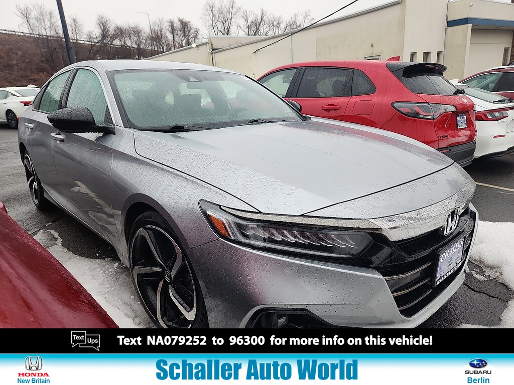 Lunar Silver Metallic 2022 Honda Accord Sport 1.5T I4 DOHC 16V Turbocharged VTEC CVT FWD8 Speakers ABS brakes Adaptive Cruise Control: Adaptive Cruise Control (ACC) with Low-Speed Follow Air Conditioning Alloy wheels AM/FM radio Apple CarPlay/Android Auto Auto High-beam Headlights Automatic temperature control Brake assist Bumpers: body-color Delay-off headlights Driver door bin Driver vanity mirror Dual front impact airbags Dual front side impact airbags Electronic Stability Control Emergency communication system: HondaLink Fabric w/Synthetic Leather Seat Trim Forward collision: Collision Mitigation Braking System (CMBS) + FCW mitigation Four wheel independent suspension Front anti-roll bar Front Bucket Seats Front Center Armrest Front dual zone A/C Front fog lights Front reading lights Fully automatic headlights Illuminated entry Knee airbag Lane Departure Warning System Leather Shift Knob Leather steering wheel Low tire pressure warning Occupant sensing airbag Outside temperature display Overhead airbag Overhead console Panic alarm Passenger door bin Passenger vanity mirror Power door mirrors Power driver seat Power steering Power windows Radio data system Radio: 180-Watt AM/FM Audio System Rear anti-roll bar Rear seat center armrest Rear window defroster Remote keyless entry Security system Speed control Speed-sensing steering Speed-Sensitive Wipers Split folding rear seat Spoiler Steering wheel mounted audio controls Tachometer Telescoping steering wheel Tilt steering wheel Traction control Trip computer Variably intermittent wipers. Odometer is 13225 miles below market average! 29/35 City/Highway MPGSchaller Auto Group has TWO Used Car Locations: Right off Route 9 in New Britain and Route 9 and the Berlin Turnpike in Berlin. Please call 860-826-2023 to confirm this Vehicle's Location. All of our Pre-Owned Vehicles go through our Comprehensive 125 Point Quality Inspection. Every Schaller pre-owned vehicle comes with warranty coverage! With all budgets in mind we now offer Schaller âValue Carsâ starting at $2995 and include a 30 day satisfaction guarantee and all come with a FREE Carfax Vehicle History Report. The Schaller Auto Group is Family Owned and Operated for Over 65 Years and is known for Selling Top Quality Used Vehicles and Standing behind them After the Sale!