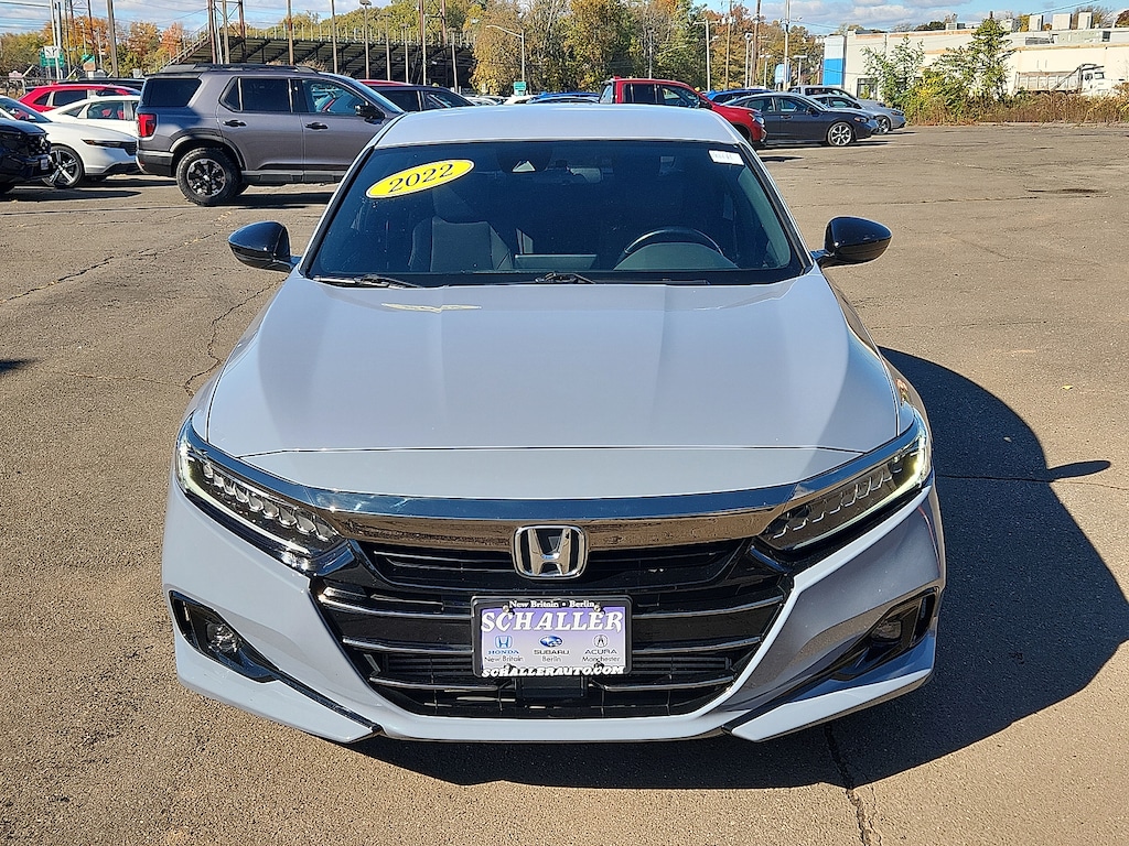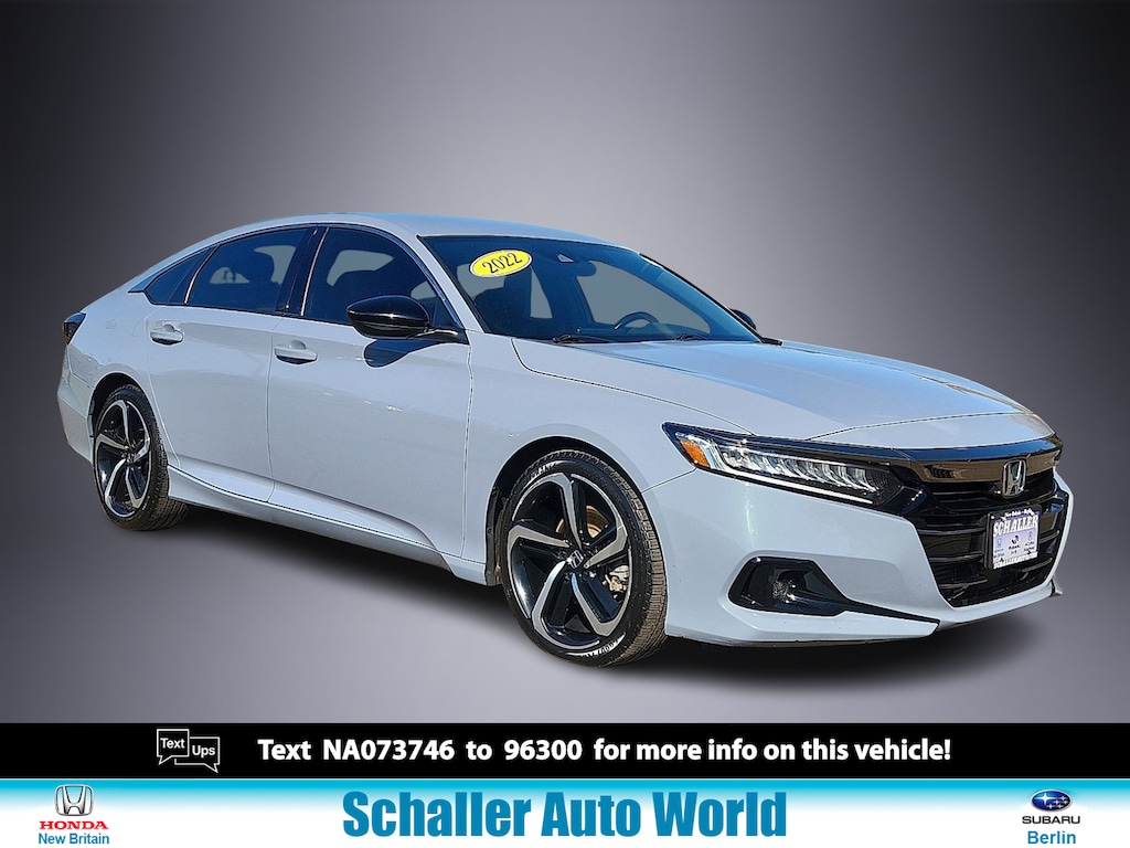 "Gray 2022 Honda Accord Sport 1.5T I4 DOHC 16V Turbocharged VTEC CVT FWD4-Wheel Disc Brakes 8 Speakers ABS brakes Adaptive Cruise Control: Adaptive Cruise Control (ACC) with Low-Speed Follow Air Conditioning Alloy wheels AM/FM radio Apple CarPlay/Android Auto Auto High-beam Headlights Automatic temperature control Brake assist Bumpers: body-color Delay-off headlights Driver door bin Driver vanity mirror Dual front impact airbags Dual front side impact airbags Electronic Stability Control Emergency communication system: HondaLink Exterior Parking Camera Rear Fabric w/Synthetic Leather Seat Trim Forward collision: Collision Mitigation Braking System (CMBS) + FCW mitigation Four wheel independent suspension Front anti-roll bar Front Bucket Seats Front Center Armrest Front dual zone A/C Front fog lights Front reading lights Fully automatic headlights Illuminated entry Knee airbag Lane Departure Warning System Leather Shift Knob Leather steering wheel Low tire pressure warning Occupant sensing airbag Outside temperature display Overhead airbag Overhead console Panic alarm Passenger door bin Passenger vanity mirror Power door mirrors Power driver seat Power steering Power windows Radio data system Radio: 180-Watt AM/FM Audio System Rear anti-roll bar Rear seat center armrest Rear window defroster Remote keyless entry Security system Speed control Speed-sensing steering Speed-Sensitive Wipers Split folding rear seat Spoiler Steering wheel mounted audio controls Tachometer Telescoping steering wheel Tilt steering wheel Traction control Trip computer Variably intermittent wipers Wheels: 19""Machine-Finished Alloy w/Black Inserts. 29/35 City/Highway MPGSchaller Auto Group has TWO Used Car Locations: Right off Route 9 in New Britain and Route 9 and the Berlin Turnpike in Berlin. Please call 860-826-2023 to confirm this Vehicle's Location. All of our Pre-Owned Vehicles go through our Comprehensive 125 Point Quality Inspection. Every Schaller pre-owned vehicle comes with warranty coverage! With all budgets in mind we now offer Schaller âValue Carsâ starting at $2995 and include a 30 day satisfaction guarantee and all come with a FREE Carfax Vehicle History Report. The Schaller Auto Group is Family Owned and Operated for Over 65 Years and is known for Selling Top Quality Used Vehicles and Standing behind them After the Sale!"