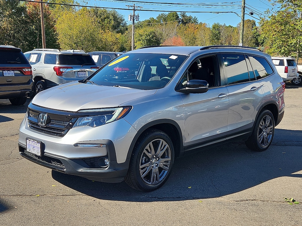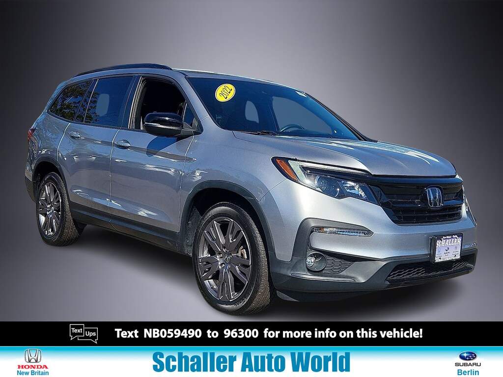 "Silver 2022 Honda Pilot Sport 3.5L V6 24V SOHC i-VTEC 9-Speed Automatic AWD3rd row seats: split-bench 4-Wheel Disc Brakes 4.33 Axle Ratio 7 Speakers A/V remote: CabinControl ABS brakes Air Conditioning Alloy wheels AM/FM radio: SiriusXM Apple CarPlay/Android Auto Auto High-beam Headlights Automatic temperature control Blind Spot Information (BSI) System warning Brake assist Bumpers: body-color Cloth Seat Trim Delay-off headlights Driver door bin Driver vanity mirror Dual front impact airbags Dual front side impact airbags Electronic Stability Control Emergency communication system: HondaLink Assist Exterior Parking Camera Rear Forward collision: Collision Mitigation Braking System (CMBS) + FCW mitigation Four wheel independent suspension Front anti-roll bar Front Bucket Seats Front Center Armrest Front dual zone A/C Front fog lights Front reading lights Fully automatic headlights Heated door mirrors Heated Front Bucket Seats Heated front seats Illuminated entry Lane departure: Lane Keeping Assist System (LKAS) active Low tire pressure warning Occupant sensing airbag Outside temperature display Overhead airbag Overhead console Panic alarm Passenger door bin Passenger vanity mirror Power door mirrors Power driver seat Power steering Power windows Radio data system Radio: 215-Watt Audio System Rear air conditioning Rear anti-roll bar Rear reading lights Rear seat center armrest Rear window defroster Rear window wiper Reclining 3rd row seat Remote keyless entry Roof rack: rails only Security system Speed control Speed-sensing steering Speed-Sensitive Wipers Split folding rear seat Spoiler Steering wheel mounted audio controls Tachometer Telescoping steering wheel Tilt steering wheel Traction control Trip computer Turn signal indicator mirrors Variably intermittent wipers Wheels: 20""Pewter Gray Alloy. 19/26 City/Highway MPGSchaller Auto Group has TWO Used Car Locations: Right off Route 9 in New Britain and Route 9 and the Berlin Turnpike in Berlin. Please call 860-826-2023 to confirm this Vehicle's Location. All of our Pre-Owned Vehicles go through our Comprehensive 125 Point Quality Inspection. Every Schaller pre-owned vehicle comes with warranty coverage! With all budgets in mind we now offer Schaller âValue Carsâ starting at $2995 and include a 30 day satisfaction guarantee and all come with a FREE Carfax Vehicle History Report. The Schaller Auto Group is Family Owned and Operated for Over 65 Years and is known for Selling Top Quality Used Vehicles and Standing behind them After the Sale!"