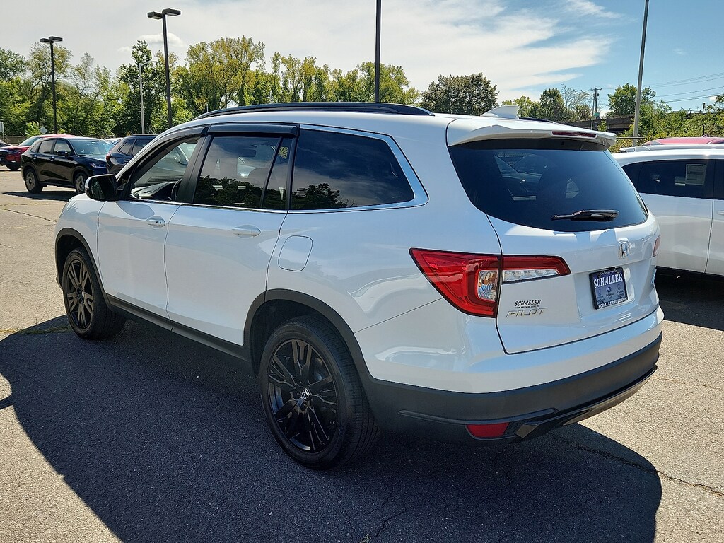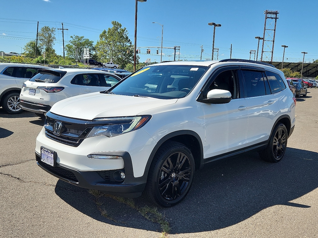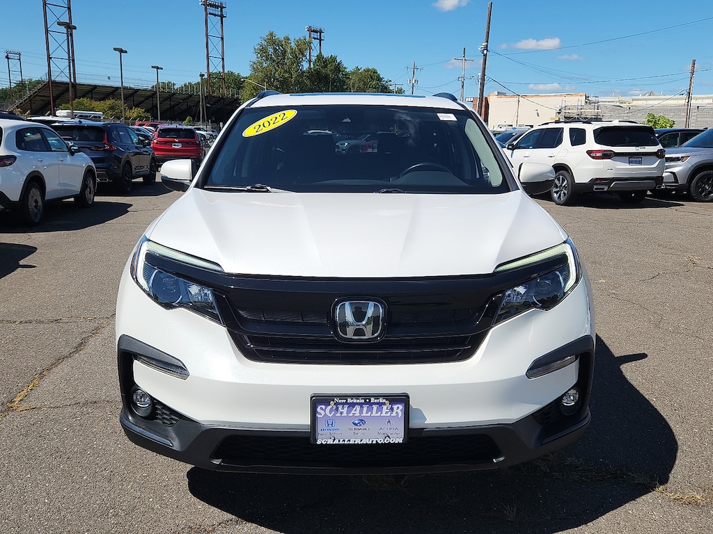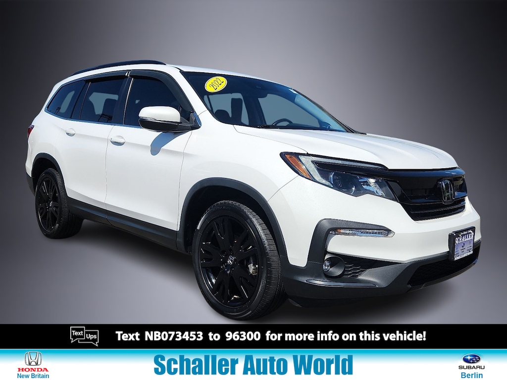 "White 2022 Honda Pilot Special Edition 3.5L V6 24V SOHC i-VTEC 9-Speed Automatic AWD3rd row seats: split-bench 4-Wheel Disc Brakes 4.33 Axle Ratio 7 Speakers A/V remote: CabinControl ABS brakes Air Conditioning Alloy wheels AM/FM radio: SiriusXM Apple CarPlay/Android Auto Auto High-beam Headlights Auto-dimming Rear-View mirror Automatic temperature control Blind Spot Information (BSI) System warning Brake assist Bumpers: body-color Delay-off headlights Driver door bin Driver vanity mirror Dual front impact airbags Dual front side impact airbags Electronic Stability Control Emergency communication system: HondaLink Assist Exterior Parking Camera Rear Forward collision: Collision Mitigation Braking System (CMBS) + FCW mitigation Four wheel independent suspension Front anti-roll bar Front Bucket Seats Front Center Armrest Front dual zone A/C Front fog lights Front reading lights Fully automatic headlights Garage door transmitter: HomeLink Heated door mirrors Heated Front Bucket Seats Heated front seats Illuminated entry Lane departure: Lane Keeping Assist System (LKAS) active Leather Seat Trim Low tire pressure warning Memory seat Occupant sensing airbag Outside temperature display Overhead airbag Overhead console Panic alarm Passenger door bin Passenger vanity mirror Power door mirrors Power driver seat Power Liftgate Power moonroof Power passenger seat Power steering Power windows Radio data system Radio: 215-Watt Audio System Rear air conditioning Rear anti-roll bar Rear reading lights Rear seat center armrest Rear window defroster Rear window wiper Reclining 3rd row seat Remote keyless entry Roof rack: rails only Security system Speed control Speed-sensing steering Speed-Sensitive Wipers Split folding rear seat Spoiler Steering wheel mounted audio controls Tachometer Telescoping steering wheel Tilt steering wheel Traction control Trip computer Turn signal indicator mirrors Variably intermittent wipers Wheels: 20""Exclusive Gloss Black Alloy. Odometer is 6120 miles below market average! 19/26 City/Highway MPGSchaller Auto Group has TWO Used Car Locations: Right off Route 9 in New Britain and Route 9 and the Berlin Turnpike in Berlin. Please call 860-826-2023 to confirm this Vehicle's Location. All of our Pre-Owned Vehicles go through our Comprehensive 125 Point Quality Inspection. Every Schaller pre-owned vehicle comes with warranty coverage! With all budgets in mind we now offer Schaller âValue Carsâ starting at $2995 and include a 30 day satisfaction guarantee and all come with a FREE Carfax Vehicle History Report. The Schaller Auto Group is Family Owned and Operated for Over 65 Years and is known for Selling Top Quality Used Vehicles and Standing behind them After the Sale!"