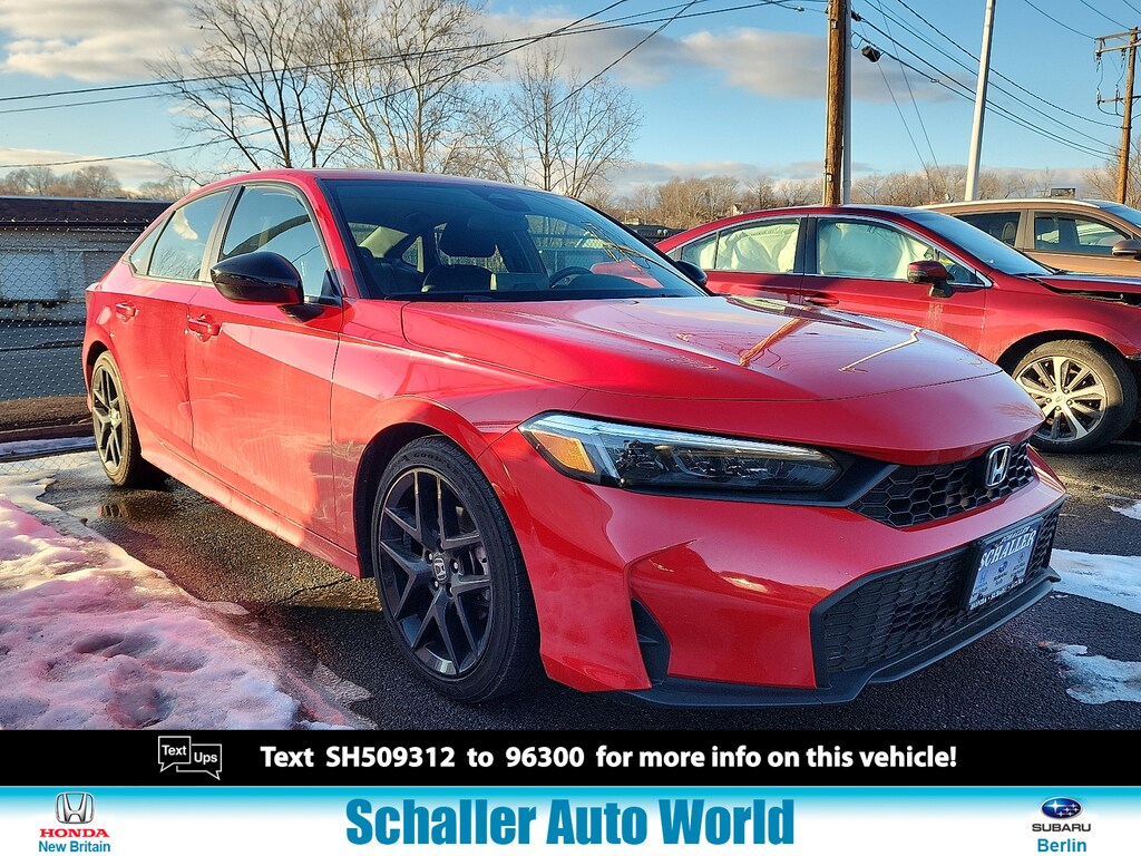 "Red 2025 Honda Civic Sport 2.0L I4 DOHC 16V CVT FWD4-Wheel Disc Brakes 8 Speakers ABS brakes Adaptive Cruise Control: Adaptive Cruise Control (ACC) with Low-Speed Follow Air Conditioning Alloy wheels AM/FM radio Apple CarPlay/Android Auto Auto High-beam Headlights Automatic temperature control Blind Spot Information (BSI) System warning Brake assist Bumpers: body-color Cloth/Leatherette Seating Surfaces Delay-off headlights Driver door bin Driver vanity mirror Dual front impact airbags Dual front side impact airbags Electronic Stability Control Emergency communication system: HondaLink Exterior Parking Camera Rear Four wheel independent suspension Front anti-roll bar Front Bucket Seats Front Center Armrest Front reading lights Fully automatic headlights Heated door mirrors Illuminated entry Knee airbag Leather Shift Knob Leather steering wheel Low tire pressure warning Occupant sensing airbag Outside temperature display Overhead airbag Panic alarm Passenger door bin Passenger vanity mirror Power door mirrors Power steering Power windows Radio data system Radio: 180-Watt Audio System Rear anti-roll bar Rear seat center armrest Rear side impact airbag Rear window defroster Remote keyless entry Security system Speed control Speed-sensing steering Split folding rear seat Steering wheel mounted audio controls Tachometer Telescoping steering wheel Tilt steering wheel Traction control Trip computer Wheels: 18""Gloss Black Alloy. Priced below KBB Fair Purchase Price! 31/39 City/Highway MPGSchaller Auto Group has TWO Used Car Locations: Right off Route 9 in New Britain and Route 9 and the Berlin Turnpike in Berlin. Please call 860-826-2023 to confirm this Vehicle's Location. All of our Pre-Owned Vehicles go through our Comprehensive 125 Point Quality Inspection. Every Schaller pre-owned vehicle comes with warranty coverage! With all budgets in mind we now offer Schaller âValue Carsâ starting at $2995 and include a 30 day satisfaction guarantee and all come with a FREE Carfax Vehicle History Report. The Schaller Auto Group is Family Owned and Operated for Over 65 Years and is known for Selling Top Quality Used Vehicles and Standing behind them After the Sale!"