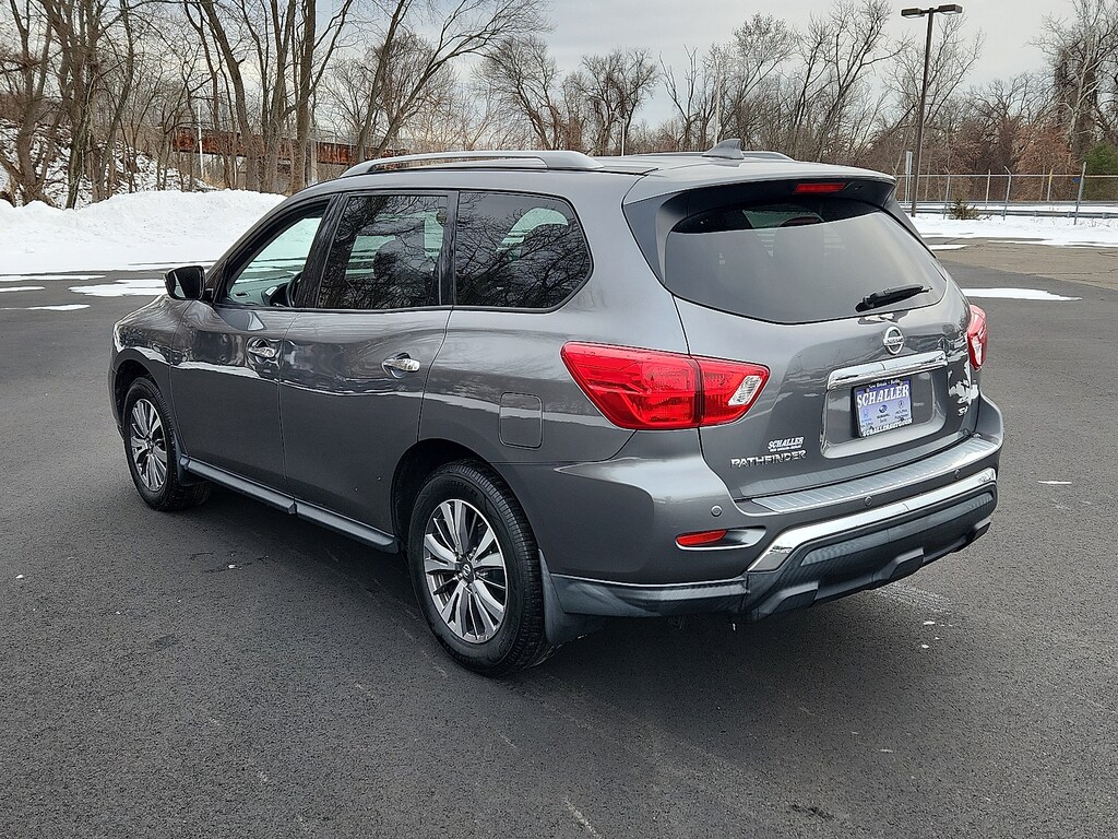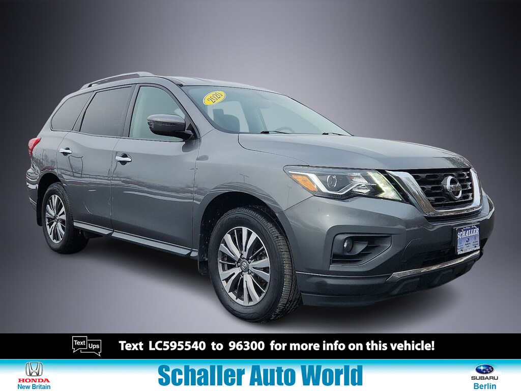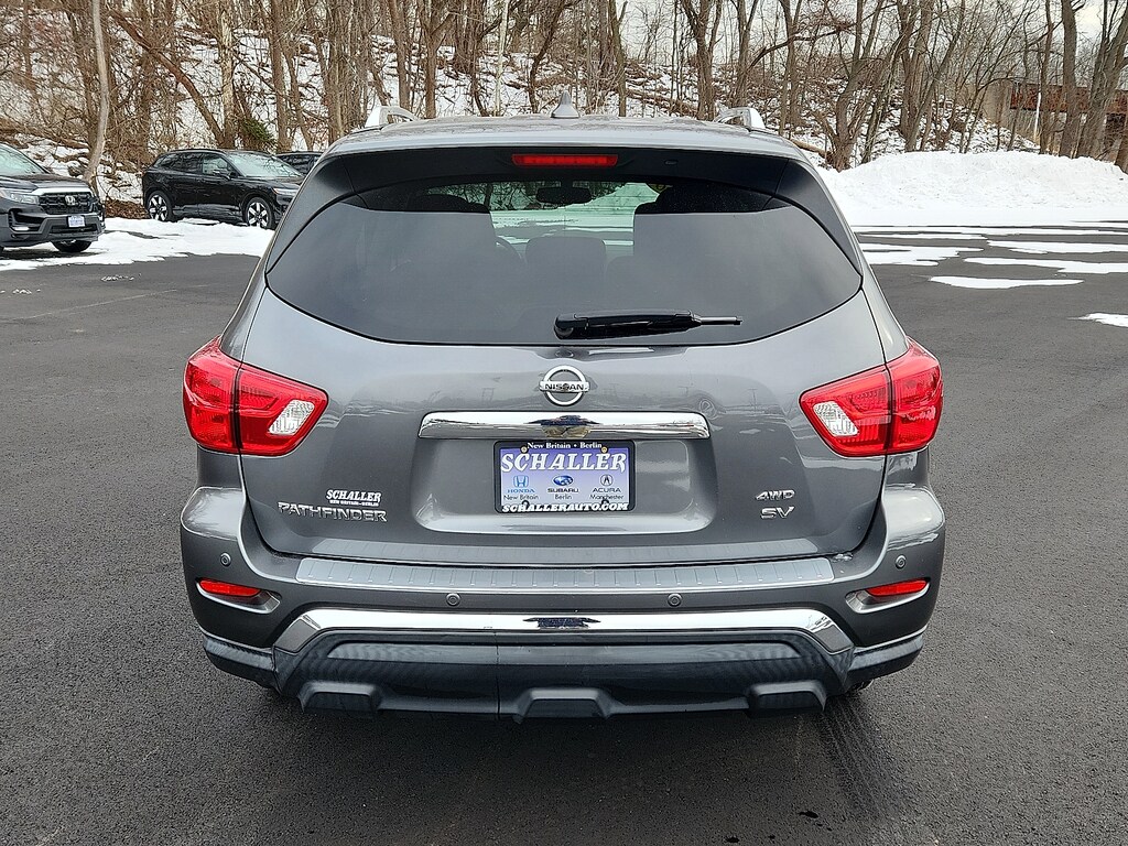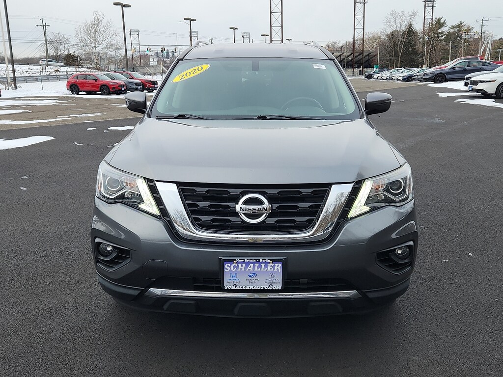"Gun Metallic 2020 Nissan Pathfinder SV V6 CVT with Xtronic 4WD3rd row seats: bench 4-Wheel Disc Brakes 5.25 Axle Ratio 6 Speakers ABS brakes Air Conditioning AM/FM radio: SiriusXM Auto-dimming Rear-View mirror Automatic temperature control Black Mold-in-Color Splash Guards Blind Spot Warning Brake assist Bumpers: body-color Carpeted Floor Mats (4-pc Set) CD player Cloth Seating Surfaces Compass Delay-off headlights Driver door bin Driver vanity mirror Dual front impact airbags Dual front side impact airbags Electronic Stability Control Four wheel independent suspension Front anti-roll bar Front Bucket Seats Front Center Armrest Front dual zone A/C Front fog lights Front reading lights Fully automatic headlights Garage door transmitter: HomeLink Illuminated entry Leather Shift Knob Leather steering wheel Low tire pressure warning Occupant sensing airbag Outside temperature display Overhead airbag Overhead console Panic alarm Passenger door bin Passenger vanity mirror Power door mirrors Power driver seat Power steering Power windows Radio data system Radio: AM/FM/CD Audio System w/NissanConnect Rear air conditioning Rear anti-roll bar Rear Bumper Protector Rear Parking Sensors Rear reading lights Rear seat center armrest Rear window defroster Rear window wiper Reclining 3rd row seat Remote keyless entry Security system Speed control Speed-sensing steering Speed-Sensitive Wipers Split folding rear seat Steering wheel mounted audio controls Tachometer Telescoping steering wheel Tilt steering wheel Traction control Trip computer Turn signal indicator mirrors Variably intermittent wipers Wheels: 18""x 7.5 J Machined Aluminum-Alloy. Odometer is 8347 miles below market average! 20/27 City/Highway MPGSchaller Auto Group has TWO Used Car Locations: Right off Route 9 in New Britain and Route 9 and the Berlin Turnpike in Berlin. Please call 860-826-2023 to confirm this Vehicle's Location. All of our Pre-Owned Vehicles go through our Comprehensive 125 Point Quality Inspection. Every Schaller pre-owned vehicle comes with warranty coverage! With all budgets in mind we now offer Schaller âValue Carsâ starting at $2995 and include a 30 day satisfaction guarantee and all come with a FREE Carfax Vehicle History Report. The Schaller Auto Group is Family Owned and Operated for Over 65 Years and is known for Selling Top Quality Used Vehicles and Standing behind them After the Sale!"