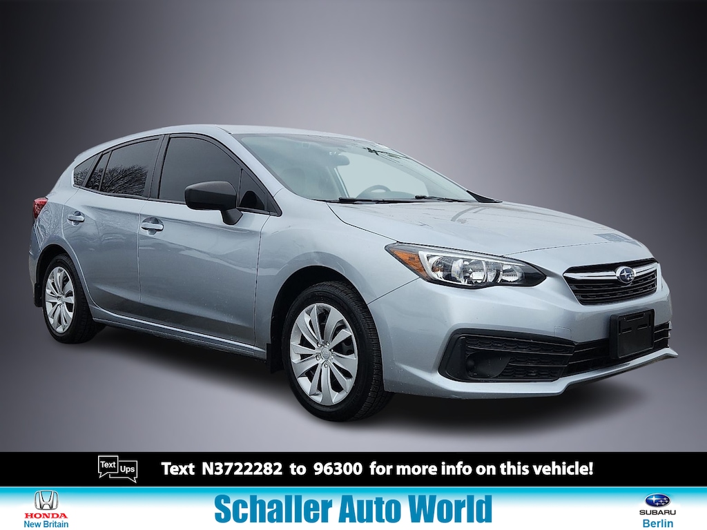 Ice Silver Metallic 2022 Subaru Impreza Base 2.0L DOHC CVT Lineartronic AWD28/36 City/Highway MPGSchaller Auto Group has TWO Used Car Locations: Right off Route 9 in New Britain and Route 9 and the Berlin Turnpike in Berlin. Please call 860-826-2023 to confirm this Vehicle's Location. All of our Pre-Owned Vehicles go through our Comprehensive 125 Point Quality Inspection. Every Schaller pre-owned vehicle comes with warranty coverage! With all budgets in mind we now offer Schaller âValue Carsâ starting at $2995 and include a 30 day satisfaction guarantee and all come with a FREE Carfax Vehicle History Report. The Schaller Auto Group is Family Owned and Operated for Over 65 Years and is known for Selling Top Quality Used Vehicles and Standing behind them After the Sale!