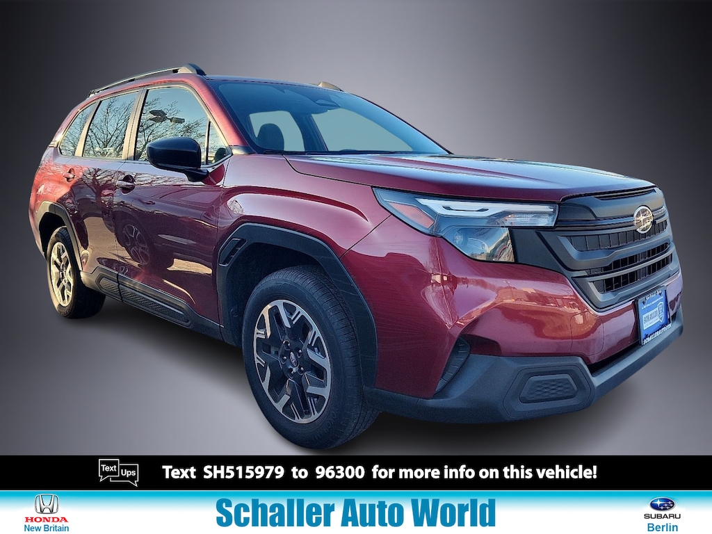 Crimson Red Pearl 2025 Subaru Forester Base 2.5L 4-Cylinder DOHC 16V Lineartronic CVT AWD26/33 City/Highway MPGSubaru Certified Pre-Owned Details: * Warranty Deductible: $0 * SiriusXM 3-Month trial subscription $500 Owner Loyalty coupon & 1 year trial subscription to STARLINK * Transferable Warranty * 152 Point Inspection * Vehicle History * Powertrain Limited Warranty: 84 Month/100000 Mile (whichever comes first) from original in-service date * Roadside AssistanceSchaller Auto Group has TWO Used Car Locations: Right off Route 9 in New Britain and Route 9 and the Berlin Turnpike in Berlin. Please call 860-826-2023 to confirm this Vehicle's Location. All of our Pre-Owned Vehicles go through our Comprehensive 125 Point Quality Inspection. Every Schaller pre-owned vehicle comes with warranty coverage! With all budgets in mind we now offer Schaller âValue Carsâ starting at $2995 and include a 30 day satisfaction guarantee and all come with a FREE Carfax Vehicle History Report. The Schaller Auto Group is Family Owned and Operated for Over 65 Years and is known for Selling Top Quality Used Vehicles and Standing behind them After the Sale!