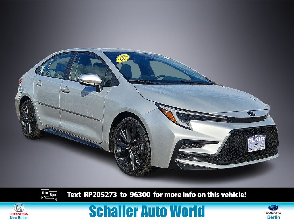 "Classic Silver Metallic 2024 Toyota Corolla SE 2.0L I4 DOHC 16V CVT FWD4-Wheel Disc Brakes 6 Speakers ABS brakes Air Conditioning Alloy wheels AM/FM radio: SiriusXM Auto High-beam Headlights Automatic temperature control Brake assist Bumpers: body-color Delay-off headlights Driver door bin Driver vanity mirror Dual front impact airbags Dual front side impact airbags Electronic Stability Control Emergency communication system: Safety Connect (up to 10-year trial subscription) Exterior Parking Camera Rear Fabric Seat Trim Four wheel independent suspension Front anti-roll bar Front Bucket Seats Front Center Armrest Front reading lights Front Sport Seats Fully automatic headlights Heated door mirrors Illuminated entry Knee airbag Leather steering wheel Low tire pressure warning Occupant sensing airbag Outside temperature display Overhead airbag Panic alarm Passenger door bin Passenger vanity mirror Power door mirrors Power steering Power windows Radio data system Radio: 8""Toyota Audio Multimedia Rear anti-roll bar Rear seat center armrest Rear side impact airbag Rear window defroster Remote keyless entry Speed control Split folding rear seat Spoiler Steering wheel mounted audio controls Tachometer Telescoping steering wheel Tilt steering wheel Traction control Trip computer Turn signal indicator mirrors Variably intermittent wipers Wheels: 18""Alloy w/Graphite-Colored Finish. Odometer is 14889 miles below market average! 31/40 City/Highway MPGSchaller Auto Group has TWO Used Car Locations: Right off Route 9 in New Britain and Route 9 and the Berlin Turnpike in Berlin. Please call 860-826-2023 to confirm this Vehicle's Location. All of our Pre-Owned Vehicles go through our Comprehensive 125 Point Quality Inspection. Every Schaller pre-owned vehicle comes with warranty coverage! With all budgets in mind we now offer Schaller âValue Carsâ starting at $2995 and include a 30 day satisfaction guarantee and all come with a FREE Carfax Vehicle History Report. The Schaller Auto Group is Family Owned and Operated for Over 65 Years and is known for Selling Top Quality Used Vehicles and Standing behind them After the Sale!"